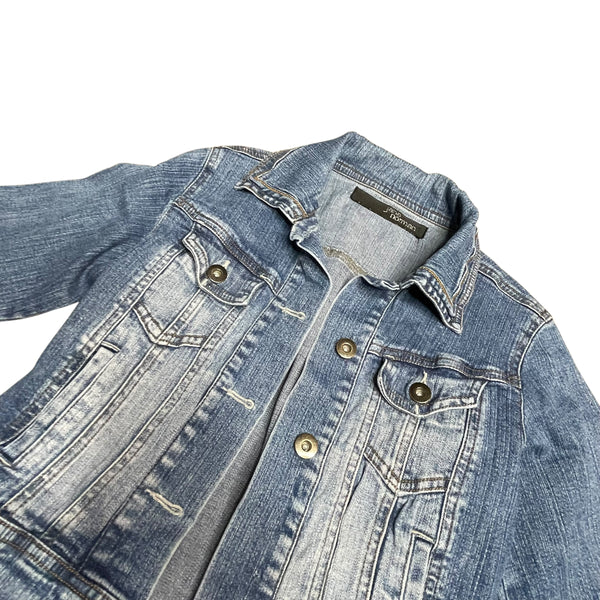 Distressed denim cropped jacket with a worn look