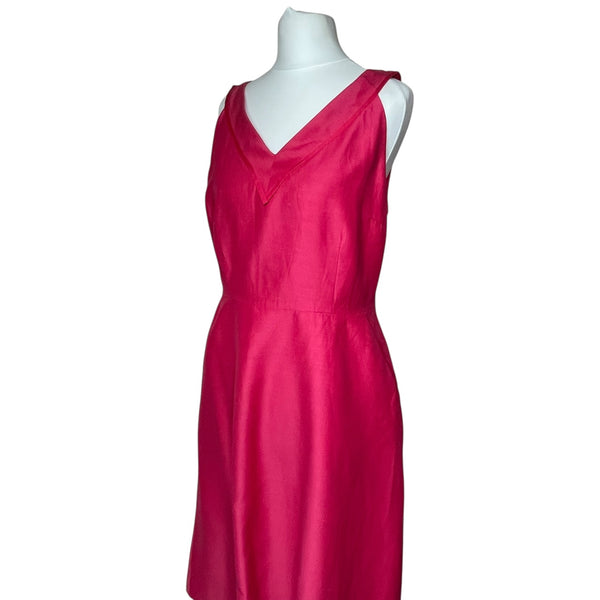 Pink sleeveless 100% silk midi dress with V-neck, zip back, and asymmetrical hem #Glamorous #PartyDress