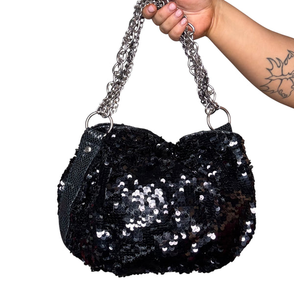 Black sequin shoulder bag with silver chunky chain strap