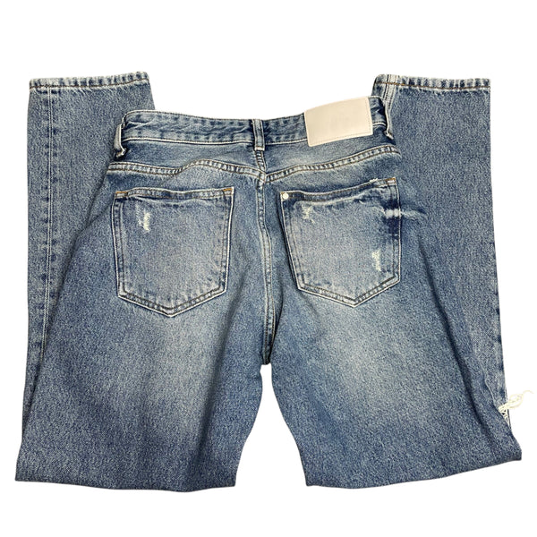 Blue denim jeans with rhinestone embellishments & intentional distressed rip on knee