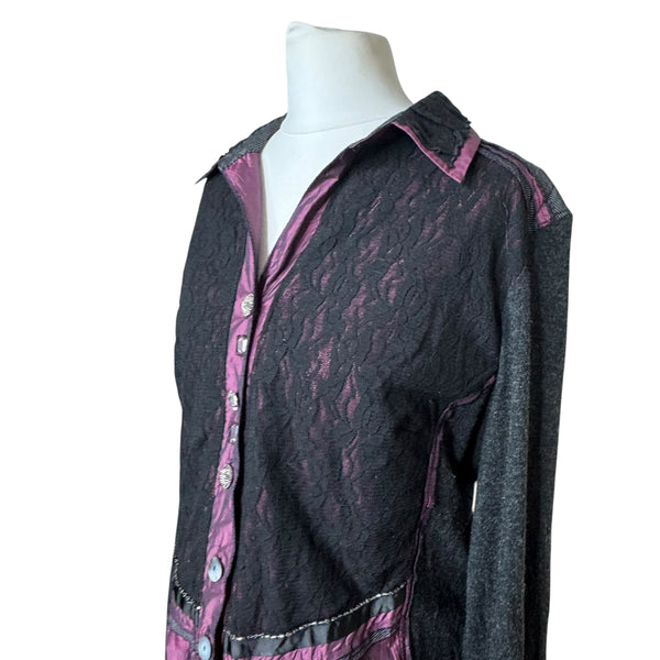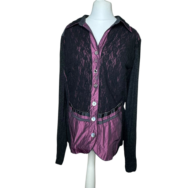 Black & purple lace button-up blouse with long sleeves and a collared neckline