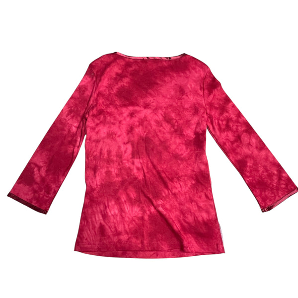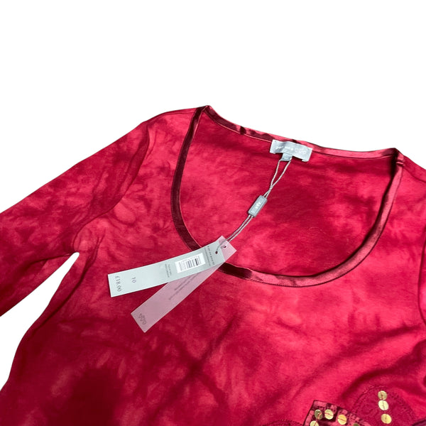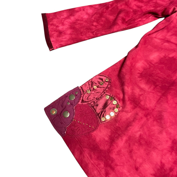 Red tie-dye floral top with beaded details, featuring a boho western vibe