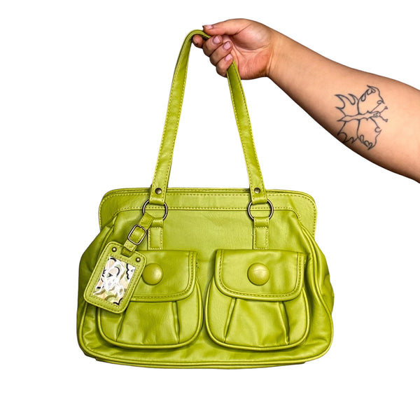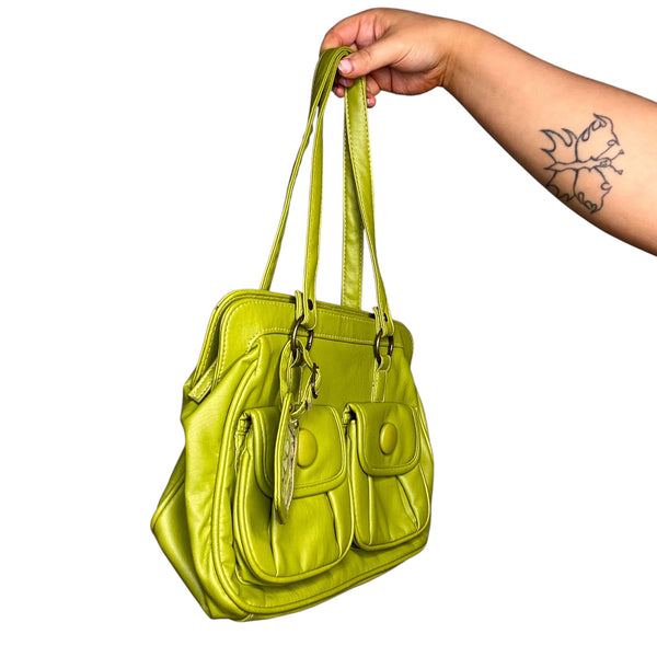 Green Y2K faux leather shoulder bag with silver hardware