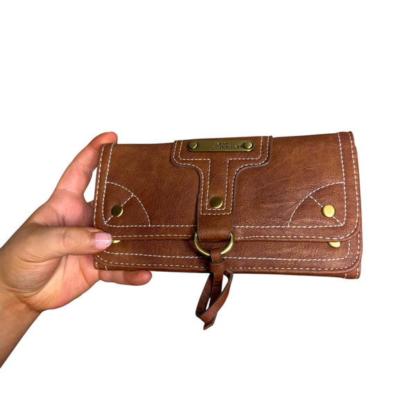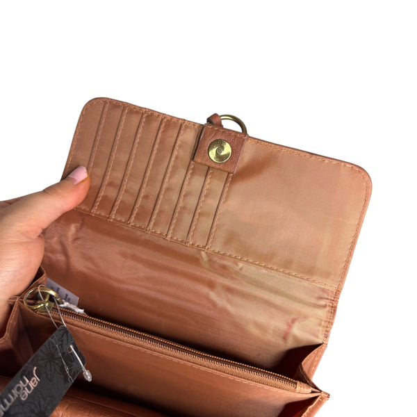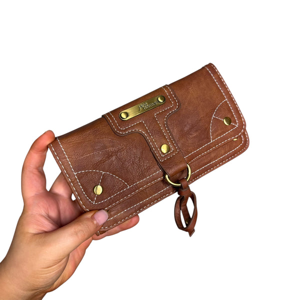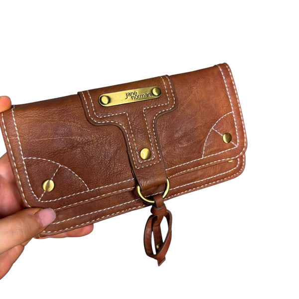 Brown faux leather Jane Norman wallet with a boho touch, featuring a unique design, multiple pockets