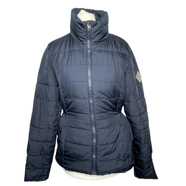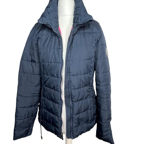 Navy blue Hollister puffer jacket with zipper closure, pockets and tie waist