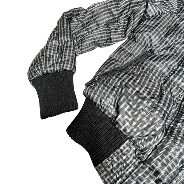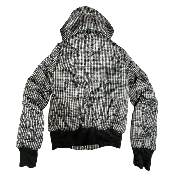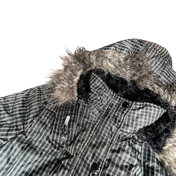Grey and black plaid y2k Fishbone puffer jacket with faux fur hood