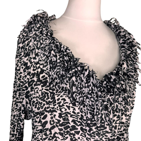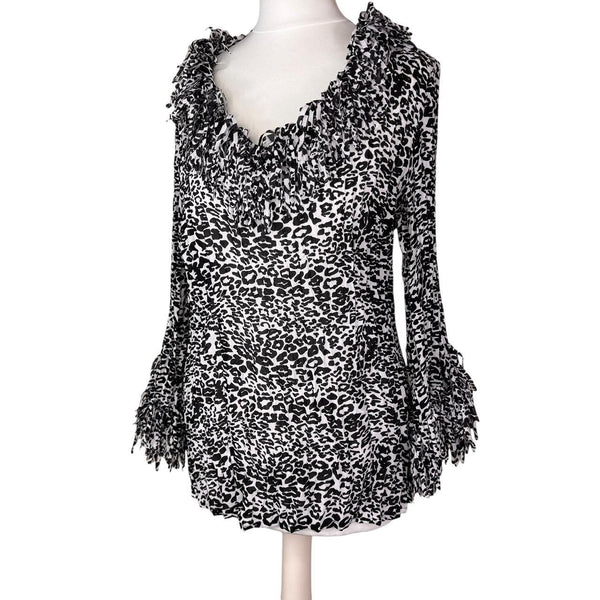 Leopard print black and white ruffle blouse long sleeve mesh top with bell sleeves