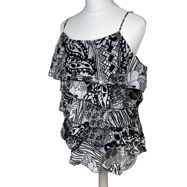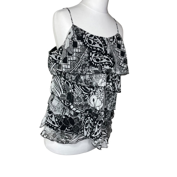 Black and white y2k paisley print ruffle cami top with spaghetti straps