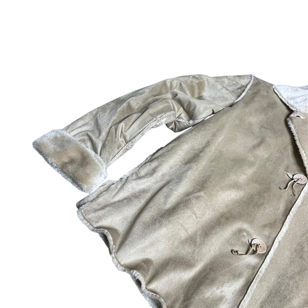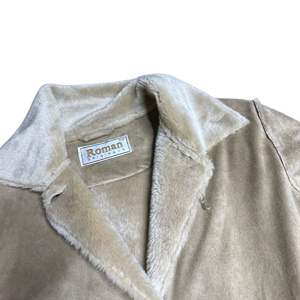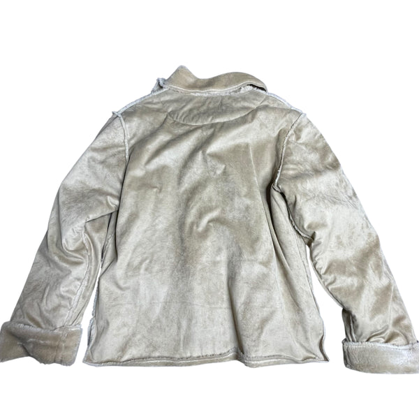 Tan suede jacket with faux fur trim, featuring a button-up design and a relaxed fit