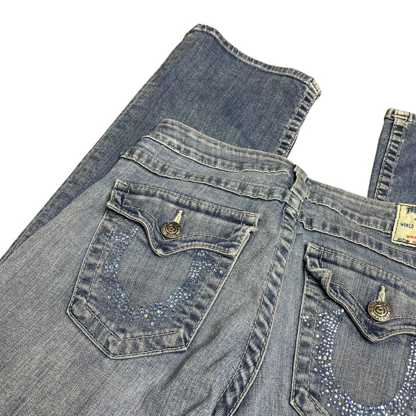 True Religion blue and silver embellished diamante Y2K jeans with distressed intentional rip on knee
