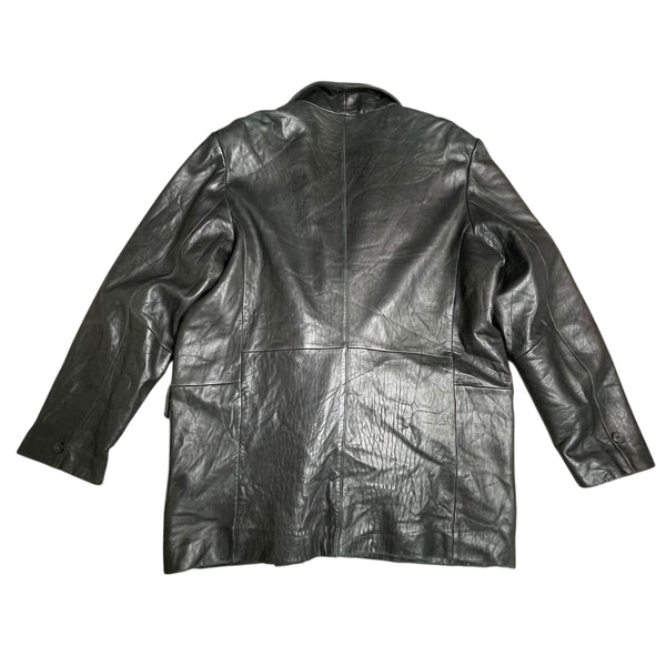 Black vintage leather jacket with button-up front, two pockets, and a collar