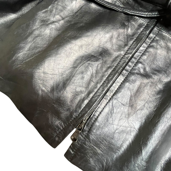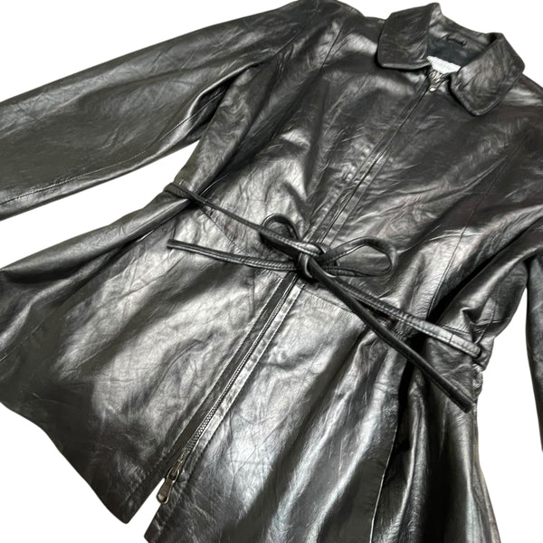 Black vintage leather jacket with tie belt & double zip, 90s style