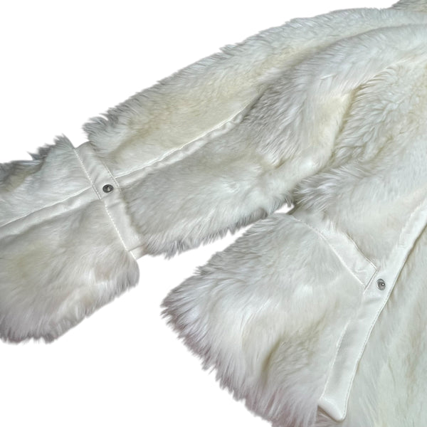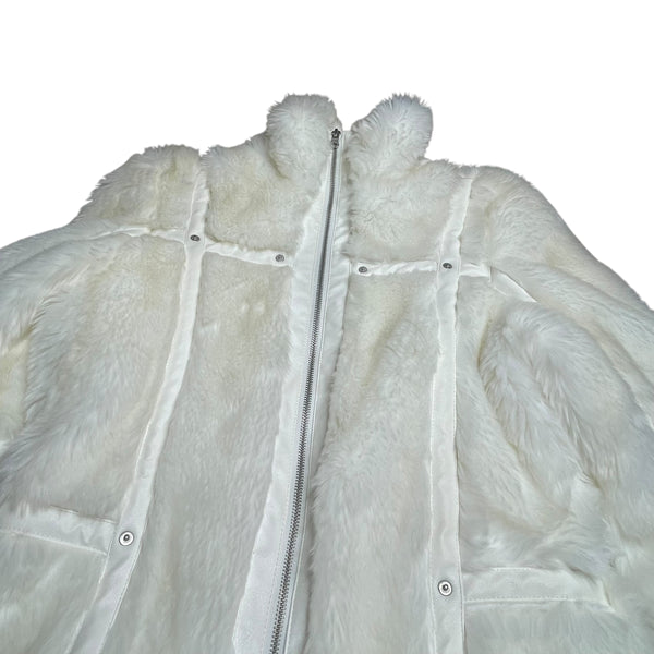 White faux fur jacket with faux leather detail, zipper and fur cuffs