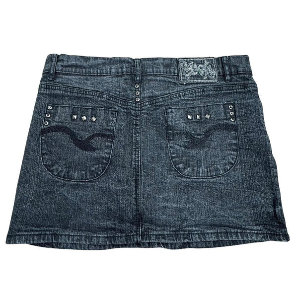 Dark wash Y2K denim mini skirt with rhinestone details