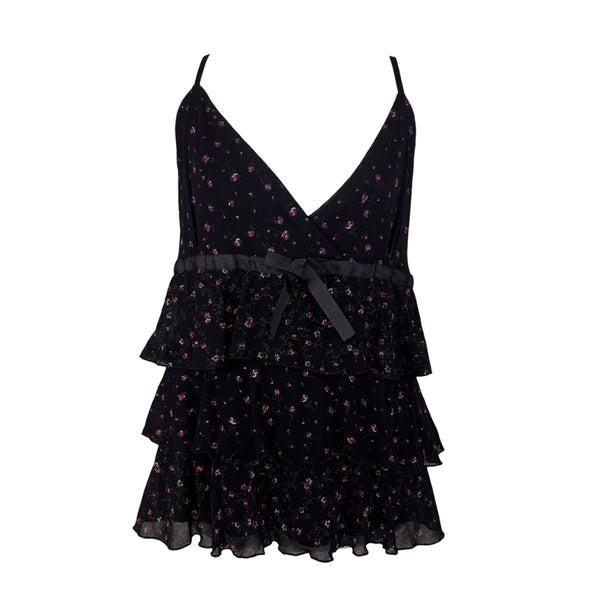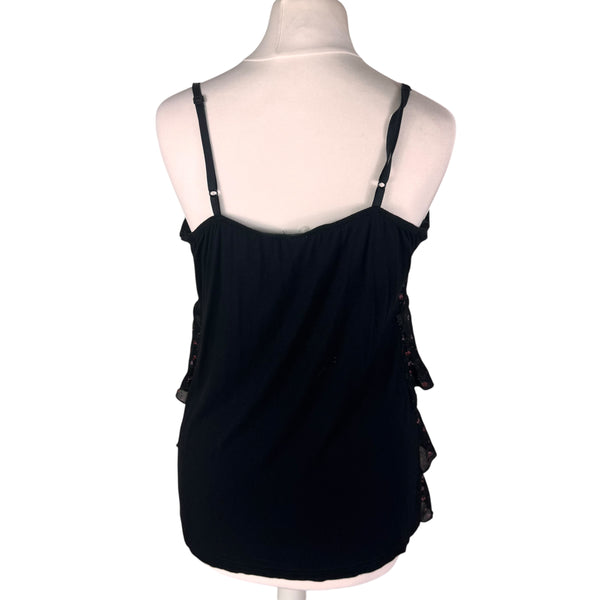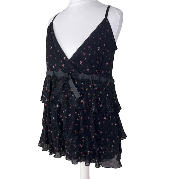 Y2K black floral print ruffle cami top
