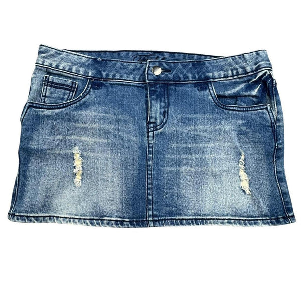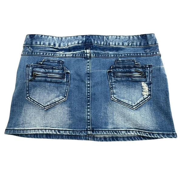 Blue Y2K denim micro mini skirt with distressed details