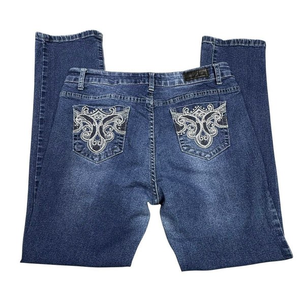 Dark wash straight leg jeans with white embroidery Y2K