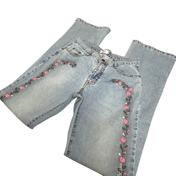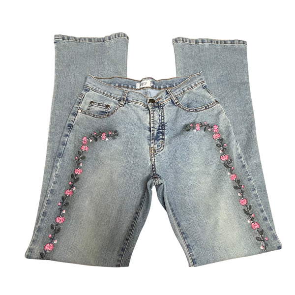 Embroidered flare jeans with pink glitter embroidered flowers, 90s y2k style jeans