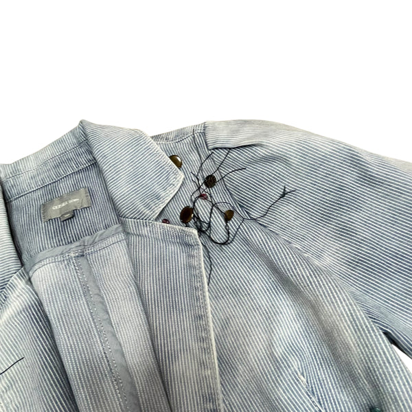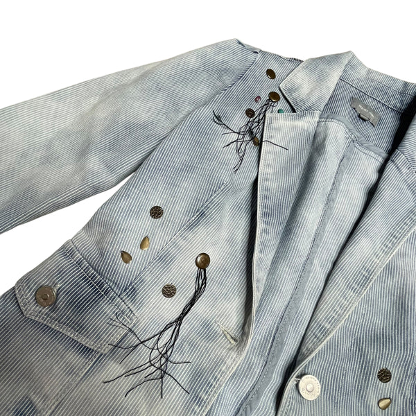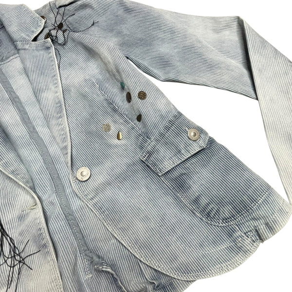 Distressed denim jacket with a punk vibe, featuring a unique blend of blue and white hues