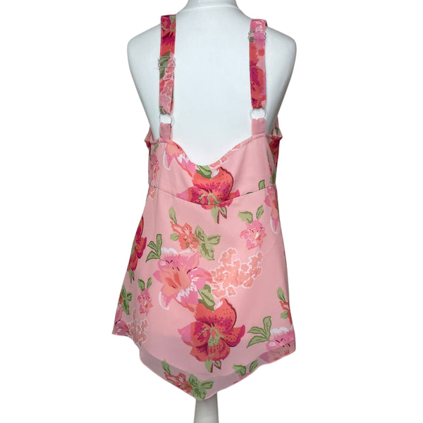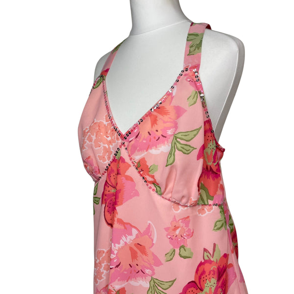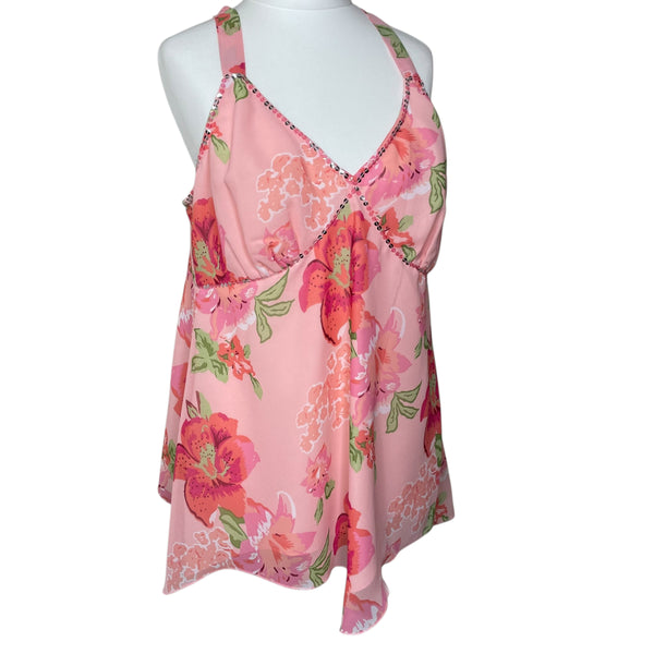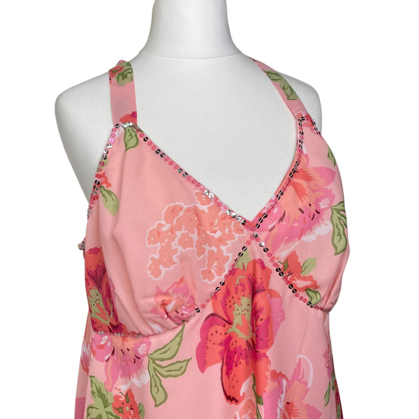 Pink floral mesh beaded y2k cami top with adjustable straps