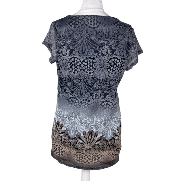 Grey & brown vintage print top with V-neckline and cap sleeves